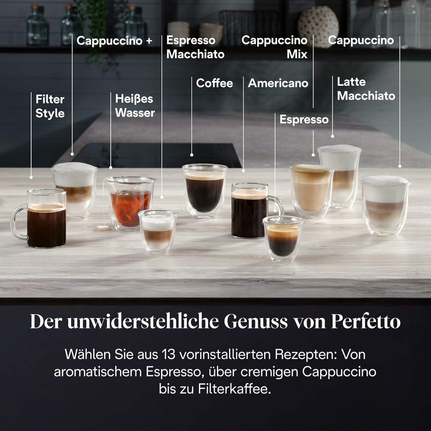 De'Longhi Magnifica Evo Next - Perfetto Fully Automatic Coffee Machine with LatteCrema Milk Frother, 13 One-Touch Drinks, Coffee and Cappuccino Coffee Machine, Coloured Touch Display, Titanium